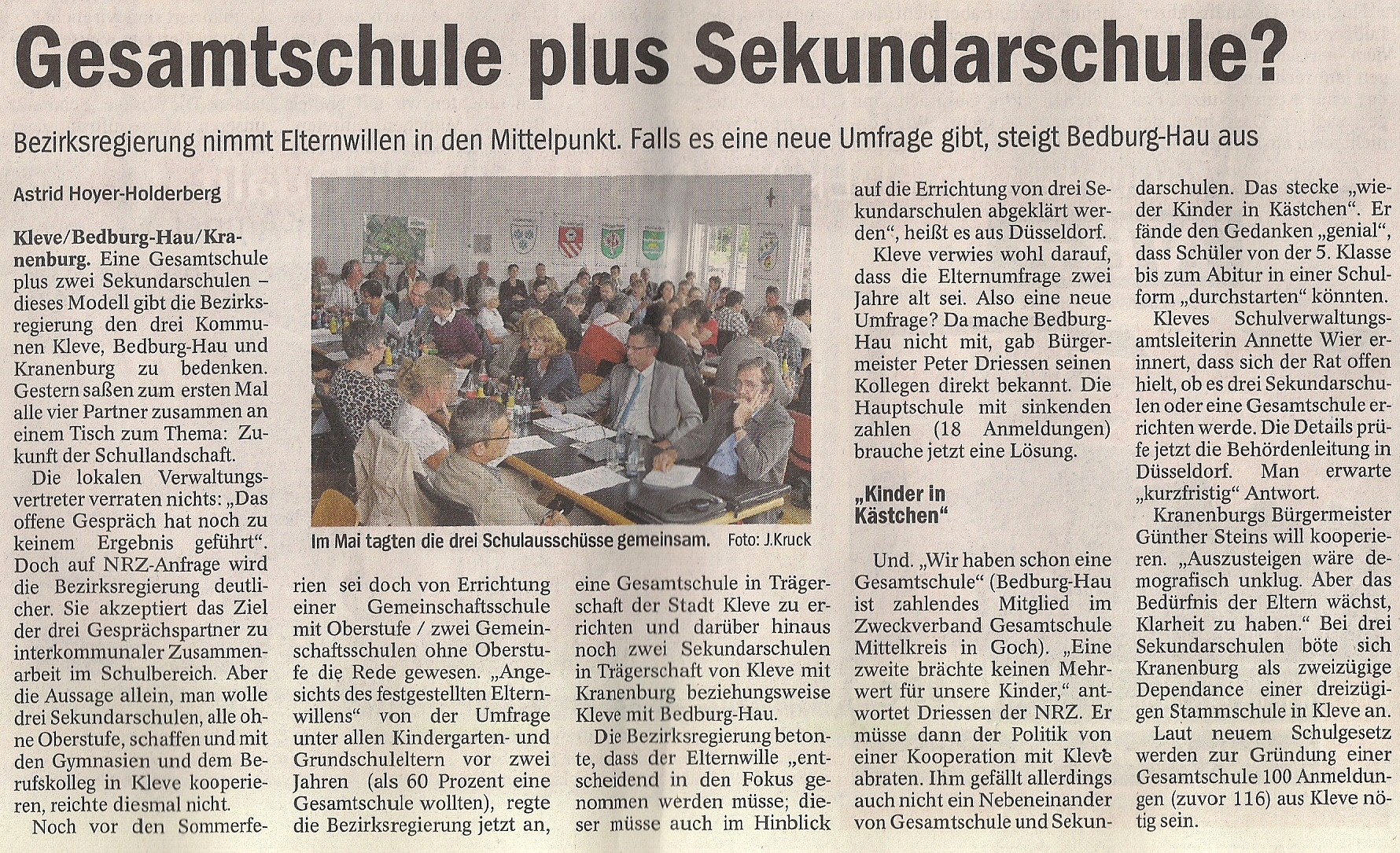 Auf der letzten Ratssitzung am 24.2.2010 wurde die Drucksache 135 / IX von den Ratsmitgliedern einstimmig zur Kenntnis genommen. Demnach sah es u.a. so aus, dass ein Antrag auf eine Gesamtschule in Kleve erst nach der positiven Stellungnahme der Nachbargemeinden Bedburg-Hau und Kranenburg gestellt werden kann. Auf eine Nachfrage, ob es möglich sei, den Antrag auf