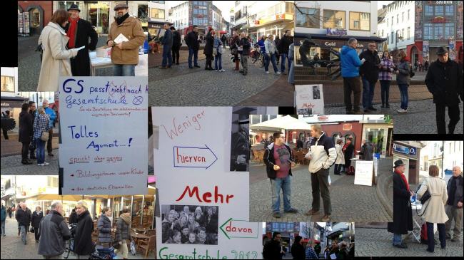Die recht spontane Aktion der Gesamtschulinitiative, am Samstag, (12.11.2011) in die Klever Fußgängerzone zu gehen, hat sich vollends gelohnt! Neben breiter Zustimmung für die Errichtung einer Gesamtschule in Kleve konnte man sich auch ein Bild über den Informationsstand der Eltern machen – Es herrscht schon einiger maßen große Verwirrung mit folgenden Schwerpunkten: